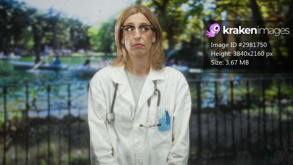 Woman doctor wearing white coat with stethoscope and pocket pens, eyes closed and hands clasped in park by pond; weariness.