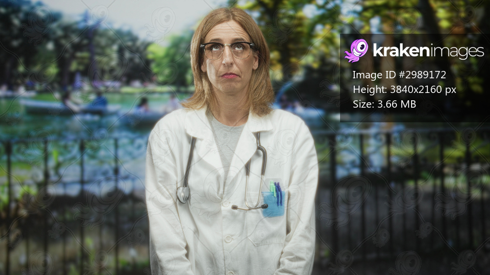 Woman doctor wearing white coat with stethoscope and pocket pens, eyes closed and hands clasped in park by pond; weariness.