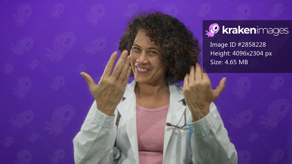 Woman doctor wearing white coat and stethoscope points finger in studio against purple wall; welcoming care.