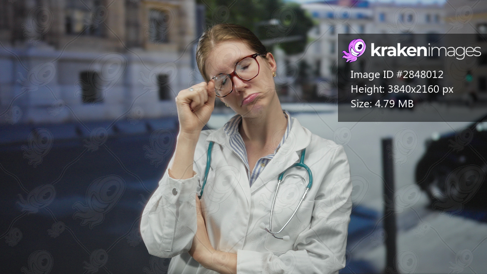 Woman doctor wearing white coat and stethoscope rubbing her eye with one hand on street; exhaustion.