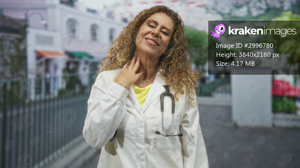 Woman doctor wearing white coat and stethoscope touches neck with hand on street near railing and storefronts, gentle smile; confidence care.