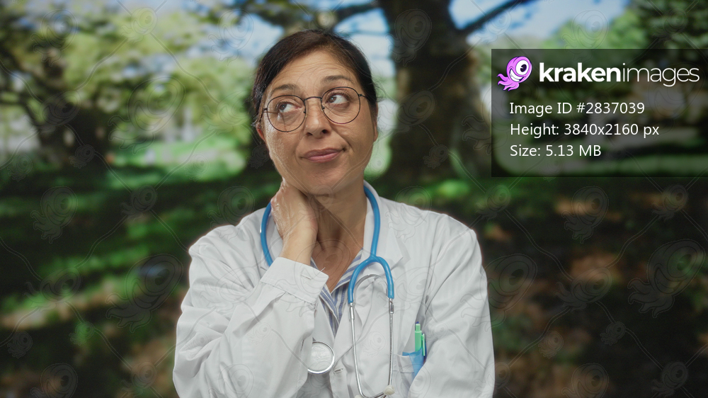 Woman doctor wearing white coat and stethoscope touches neck in green park amid trees; quiet reflection.