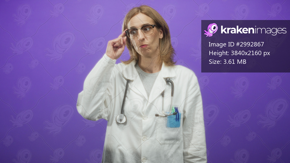 Woman doctor wearing white lab coat and glasses with stethoscope points finger to temple in a studio; thoughtful reflection.