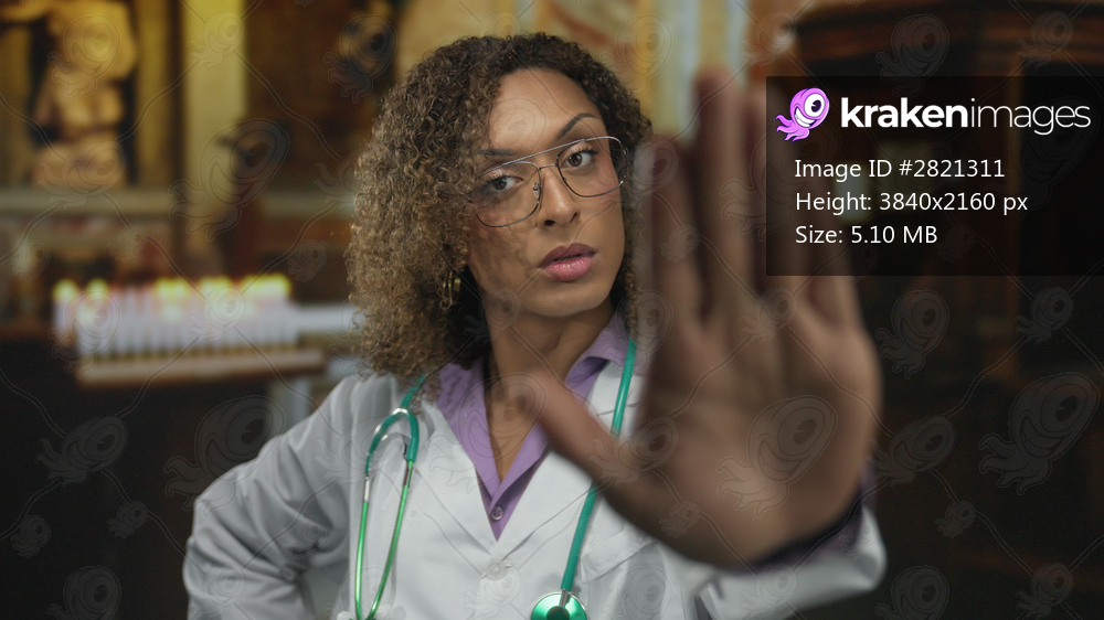 Woman doctor wearing white lab coat and stethoscope raises hand for stop inside ornate church; assertion.