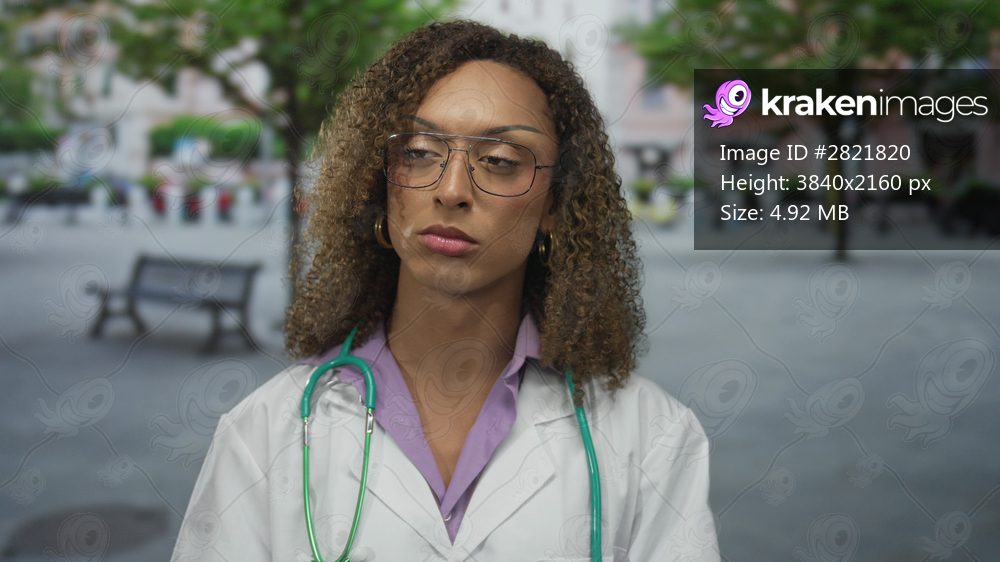 Woman doctor wearing white lab coat and stethoscope speaking and standing near a bench on a city street; compassionate care.