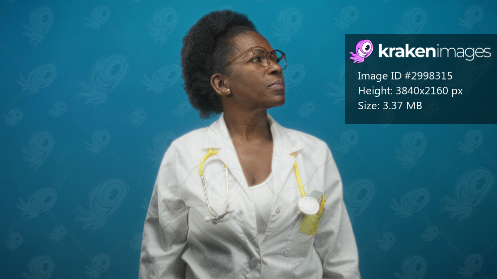 Woman doctor wearing white lab coat with yellow stethoscope turns head to right in studio; confidence compassion.