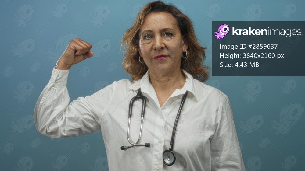 Woman doctor wearing white shirt and stethoscope raises fist in studio on blue backdrop; determination strength empowerment resilience.