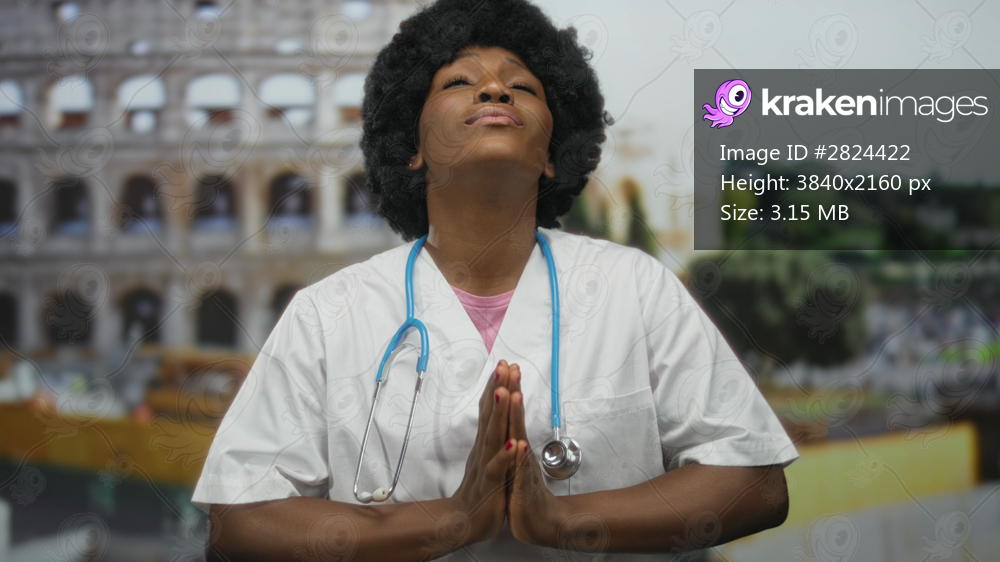 Woman doctor wearing white uniform and stethoscope folds hands in prayer with eyes closed by building; hope.