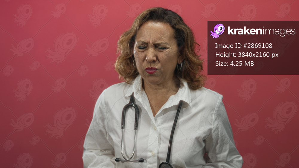 Woman doctor wears stethoscope and holds lower back in studio with red backdrop; backache discomfort.