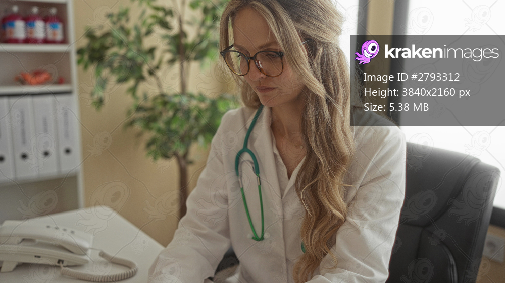 Woman doctor working on laptop at clinic desk with stethoscope, showcasing an indoor professional healthcare environment.