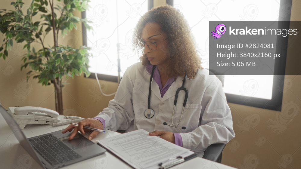 Woman doctor writes on clipboard and taps laptop with stethoscope in clinic building; diligent focus.