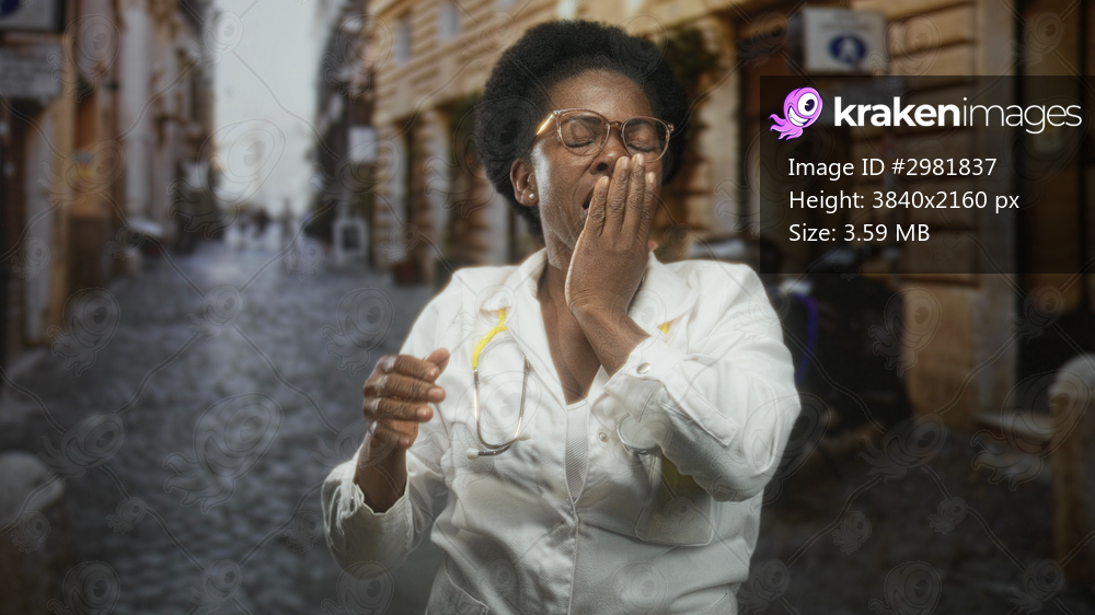 Woman doctor yawning, hand covering mouth, wearing white coat and stethoscope in cobblestone street; fatigue burnout.
