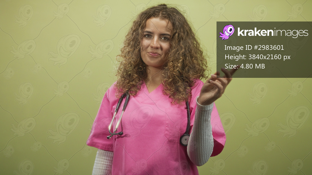 Woman doctor young curly hair wearing pink scrubs and stethoscope, snapping fingers while smiling with eyes closed against a green studio backdrop; calm care. - Kraken Images