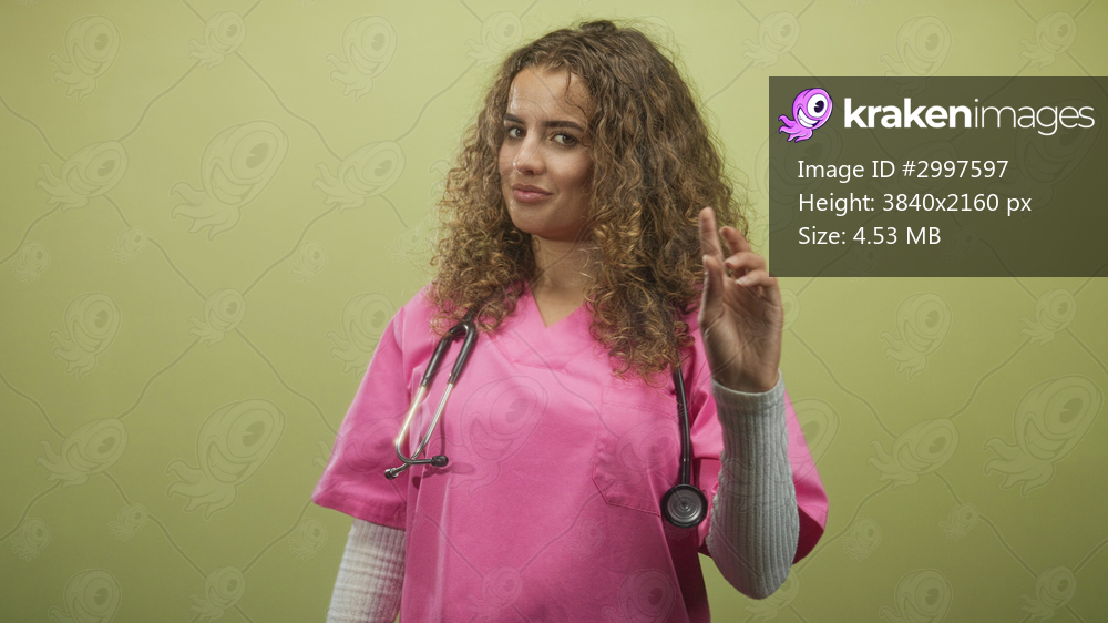 Woman doctor young curly hair wearing pink scrubs and stethoscope, snapping fingers while smiling with eyes closed against a green studio backdrop; calm care. - Kraken Images