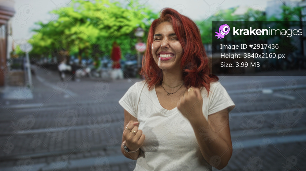 Woman doing a fist pump and pointing finger on city street while smiling with closed eyes and clenched hands; joy celebration triumph.