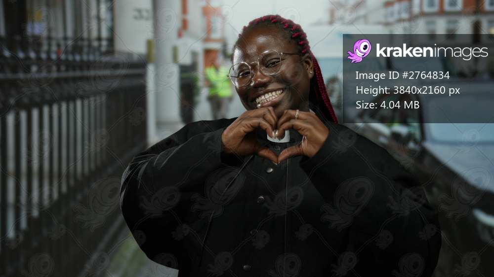 Woman dressed as a cleric smiling and making heart shape with hands on a bustling city street, with cars and buildings in the background, expressing joy and positivity outdoors. - Kraken Images
