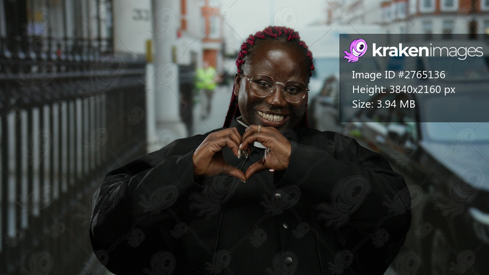 Woman dressed as a cleric smiling and making heart shape with hands on a bustling city street, with cars and buildings in the background, expressing joy and positivity outdoors. - Kraken Images