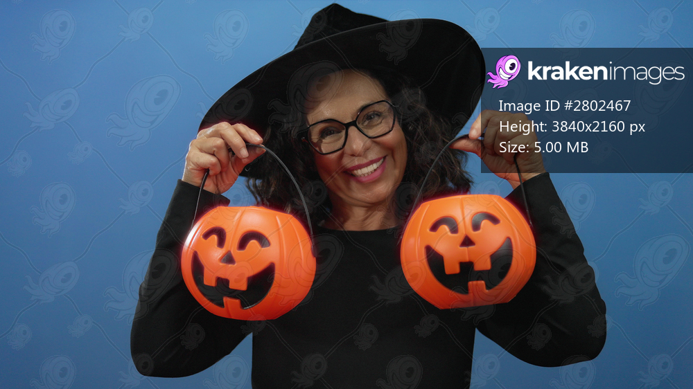Woman dressed in black holding two pumpkin baskets smiling against blue background concept halloween celebration joyful playful