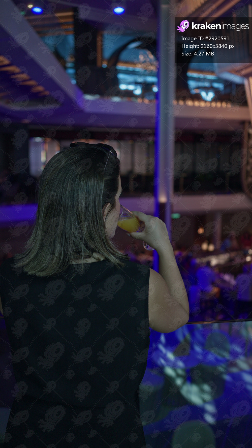 Woman drinking from a glass at an indoor bar balcony under blue purple club lighting; evening calm now.