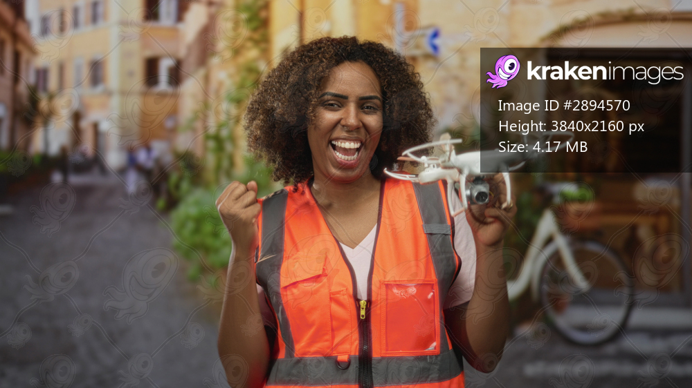 Woman drone operator wearing orange safety vest holding a quadcopter and pumps fist in a narrow street market; innovation triumph confidence.