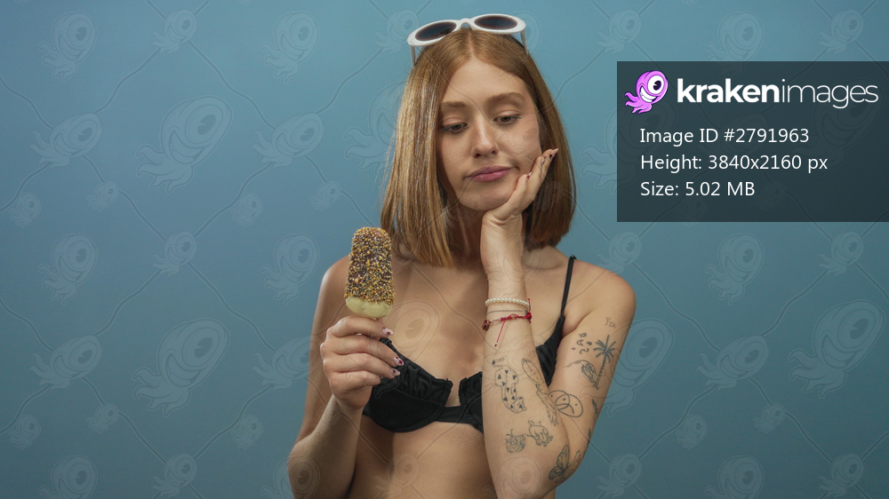 Woman eating ice cream in swimwear with tattoos against blue wall looks thoughtful and relaxed