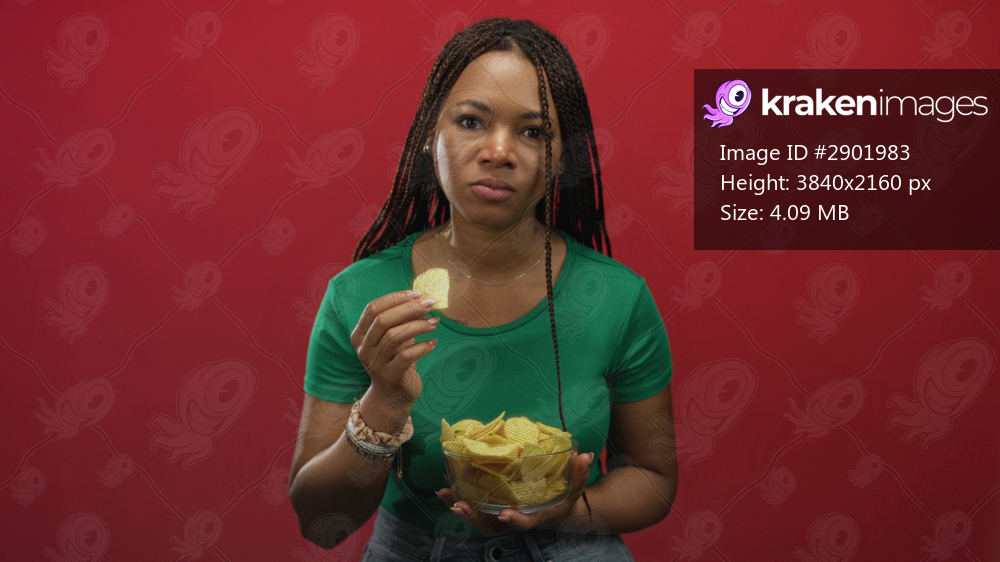 Woman eating potato chip and holding glass bowl of ridged chips while wearing green t shirt on red backdrop in studio; boredom hunger.
