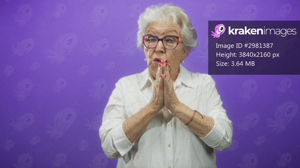 Woman elderly with white hair and eyeglasses, palms together prayer gesture, closed eyes in a purple studio set wearing white shirt and bracelet; serenity reflection. - Kraken Images