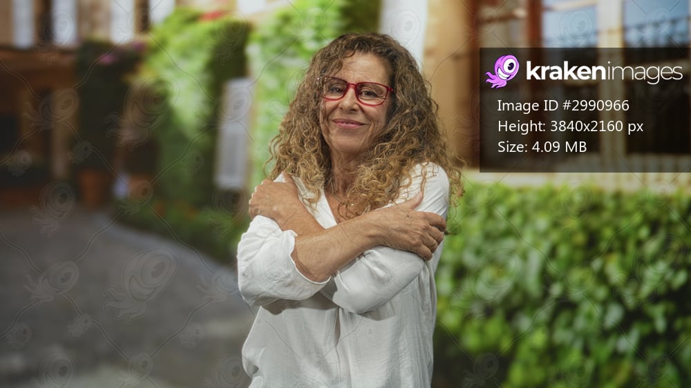 Woman embraces her shoulders, red glasses, white blouse, on a sunlit cobblestone street; self care serenity.