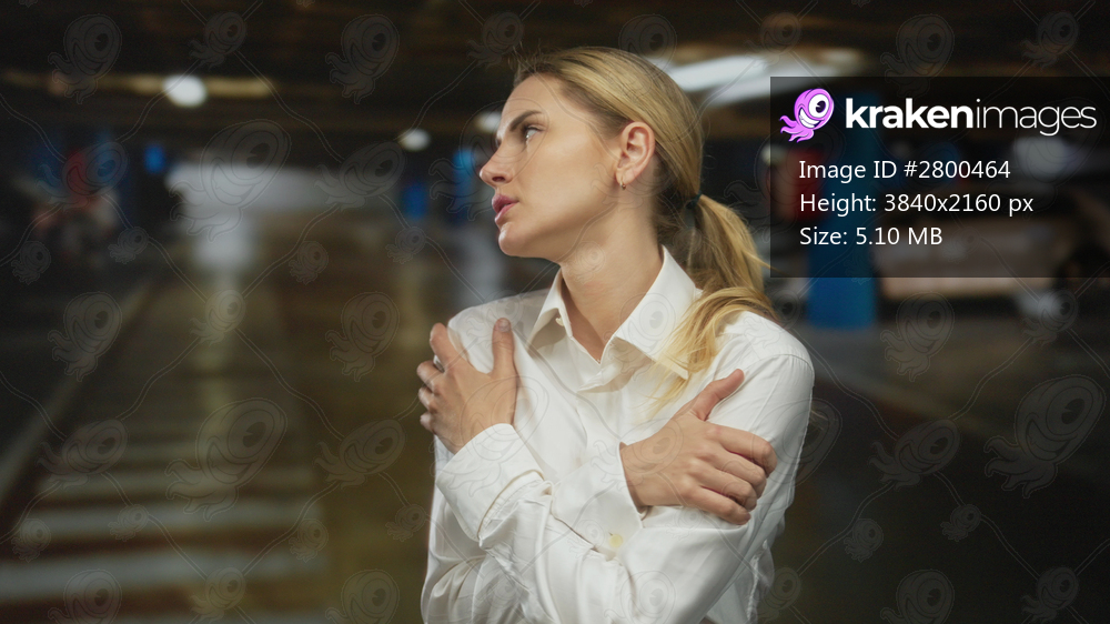 Woman embracing herself nervously in an indoor parking area with cars, showcasing anxiety and reflection in a dimly lit environment.