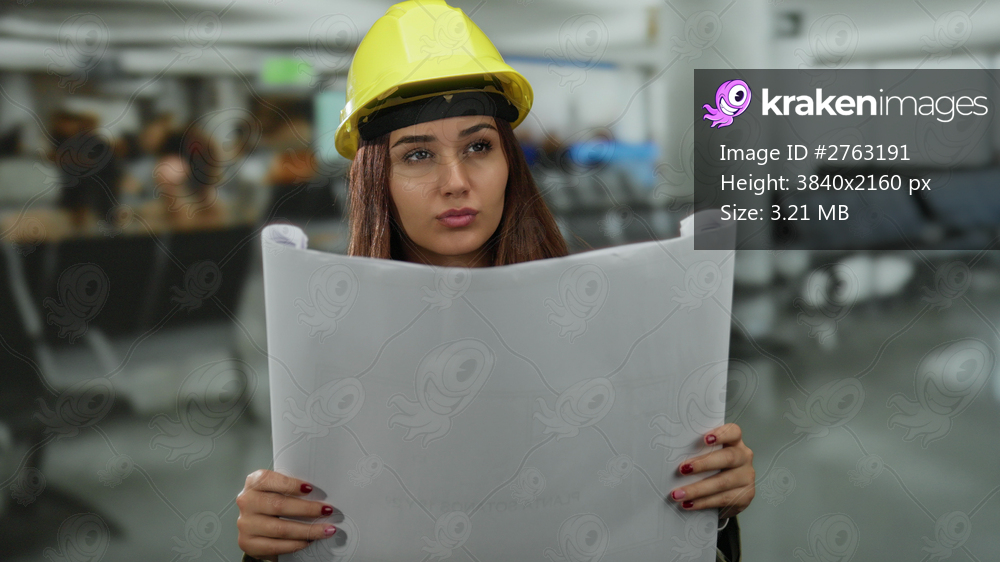 Woman engineer examining blueprints in an airport terminal, highlighting her focus in an indoor setting with architectural elements.
