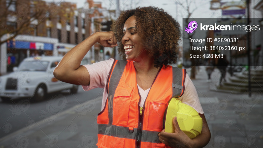 Woman engineer flexes bicep and smiles while holding yellow hardhat on city street wearing orange safety vest; pride empowerment.