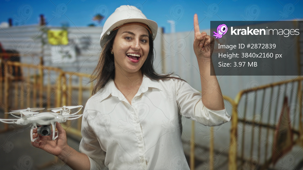 Woman engineer holding a white drone and pointing index finger toward building construction barriers with hardhat visible; excitement innovation.