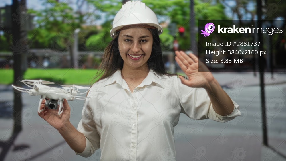 Woman engineer holding drone and waving hand on street wearing hardhat; confidence innovation teamwork.