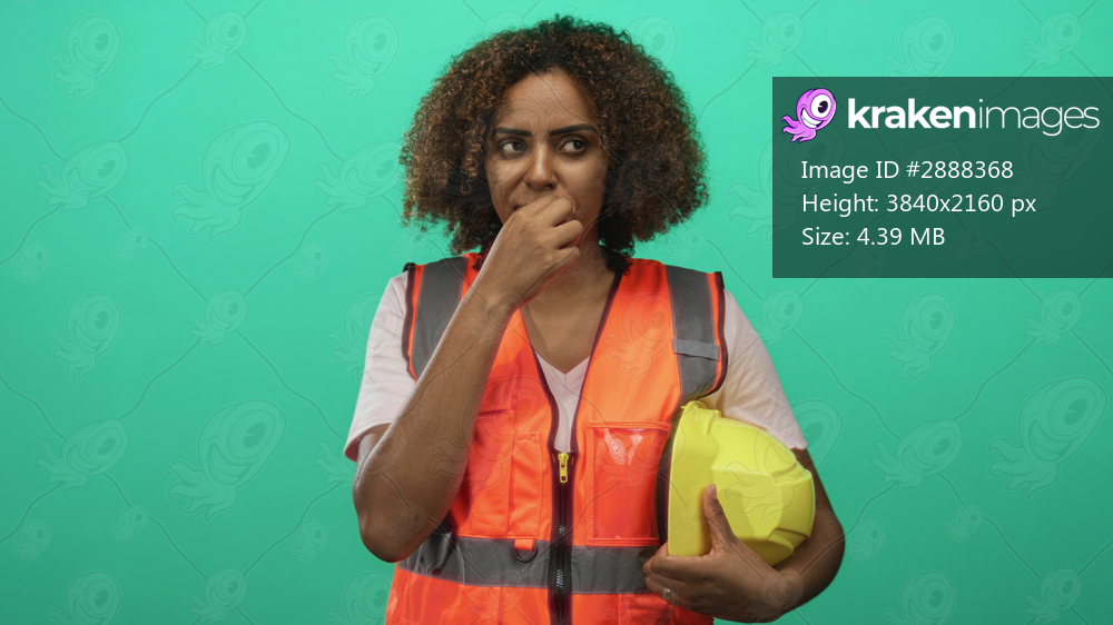Woman engineer holding yellow hardhat with finger to lips in teal studio; thoughtful safety awareness.