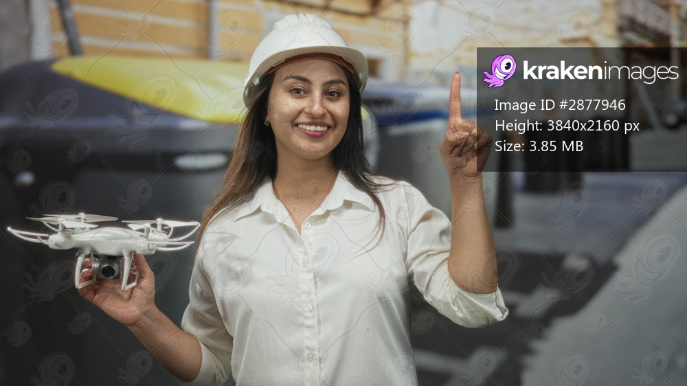 Woman engineer in hardhat holds a drone and points index finger upward on street near recycling container; innovation excitement.