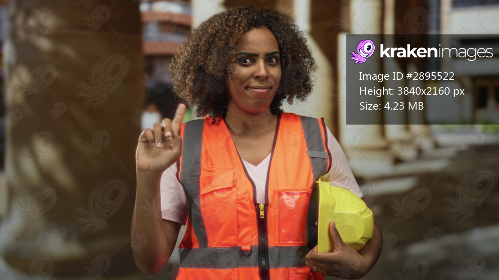 Woman engineer in orange safety vest holding yellow hardhat points finger at columns in building; practical confidence.