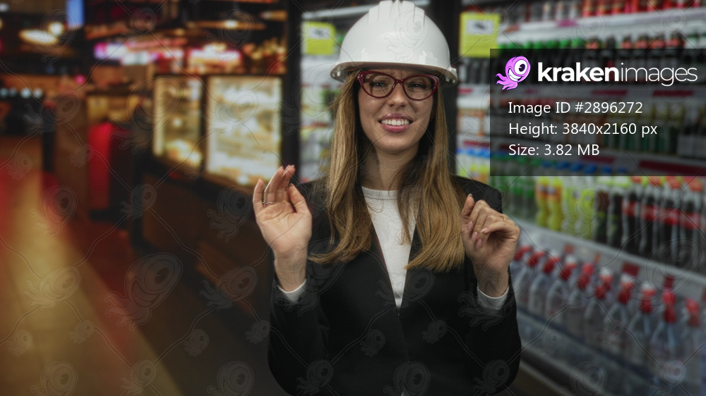 Woman engineer wearing hardhat adjusting helmet and showing hands in building; confidence safety professionalism.