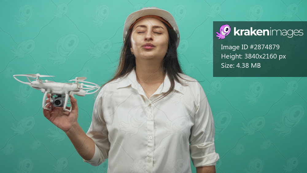 Woman engineer wearing hardhat holding white drone by hand with eyes closed in turquoise studio; innovation focus.