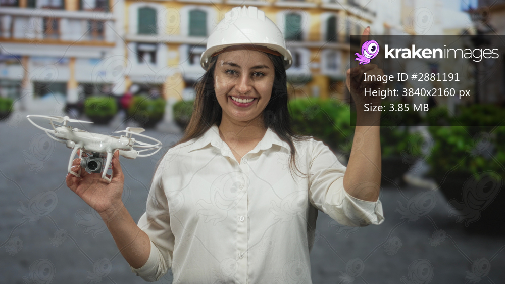 Woman engineer wearing hardhat holding white drone camera points finger up on city street; urban planning confidence.