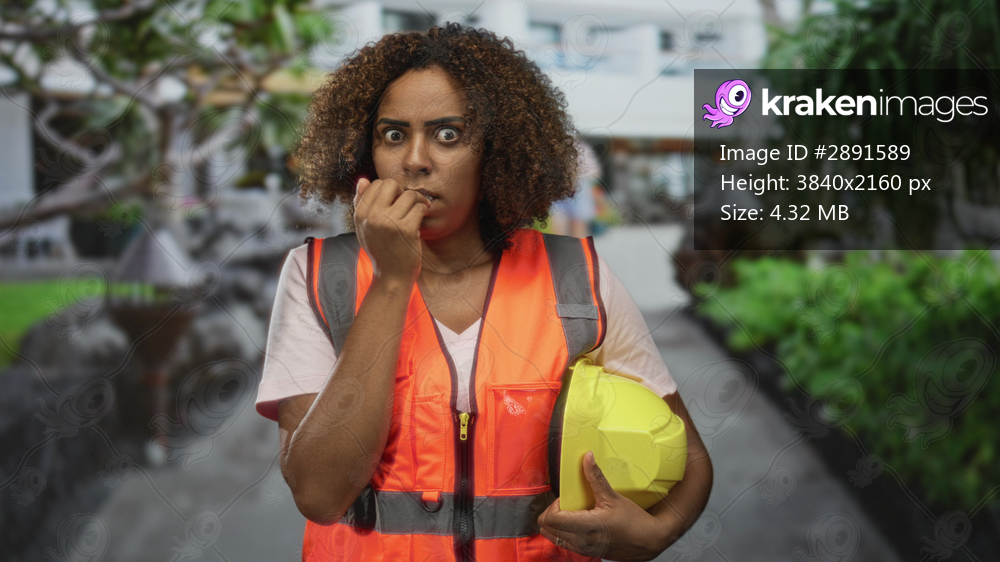 Woman engineer wearing orange safety vest bites nails while holding yellow hardhat on city street near building; anxiety uncertainty.