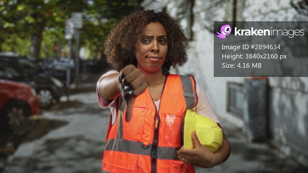 Woman engineer wearing orange safety vest holding yellow hardhat showing thumbs down on street; safety concern disapproval.