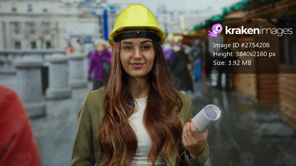 Woman engineer wearing yellow helmet holds plans outdoors on street near market showcasing architectural role in vibrant urban setting with people and shops visible. - Kraken Images