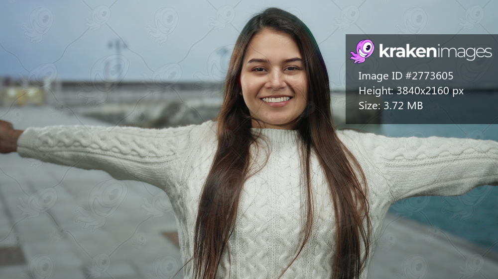 Woman enjoying a carefree moment with open arms on a seaside promenade, feeling the cool breeze and warmth of a sunny day.