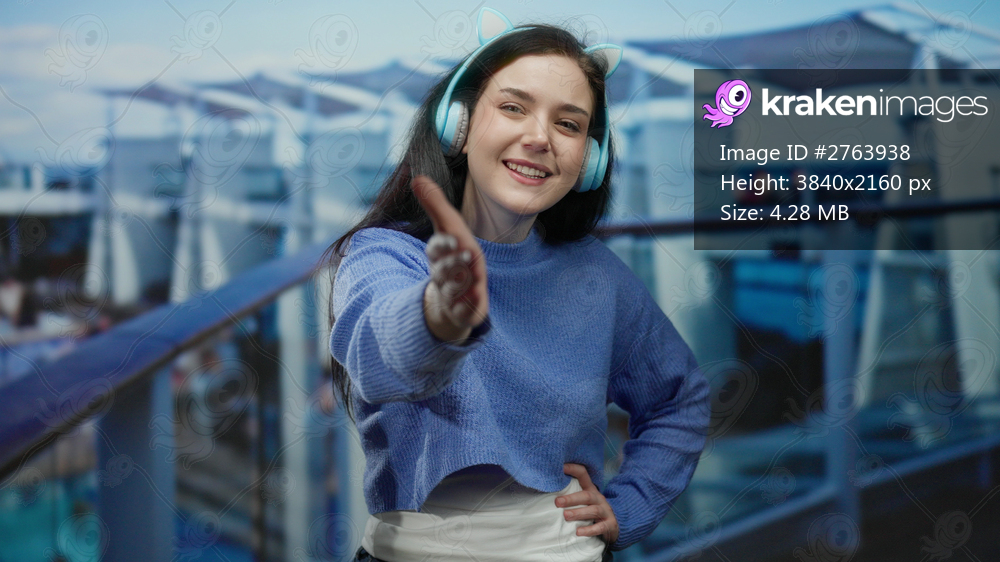 Woman enjoying a cruise ship deck with headphones and a playful expression, showcasing a relaxed atmosphere and vibrant surroundings.