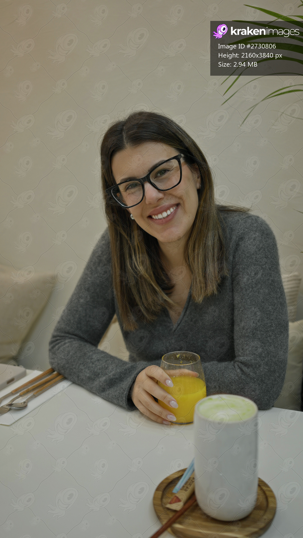 Woman enjoying a fresh juice indoors at a modern luxury restaurant, showcasing a relaxed moment with contemporary design and elegance.