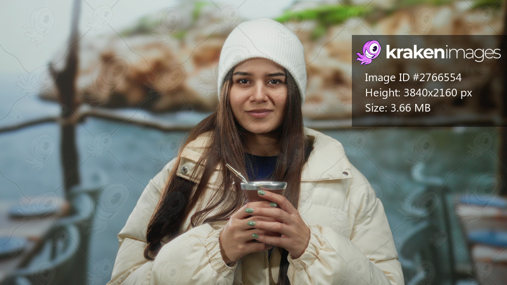 Woman enjoying a hot drink on a terrace overlooking the water, wearing a cozy white jacket and beanie, set in an outdoor coffee setting with scenic views of a rocky coastline. - Kraken Images