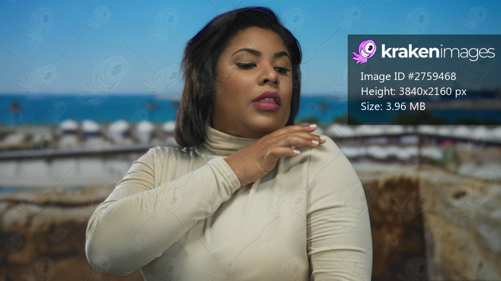 Woman enjoying a sunny beach day with palms in the background, wearing light clothing, plus size confidence and a relaxed attitude.