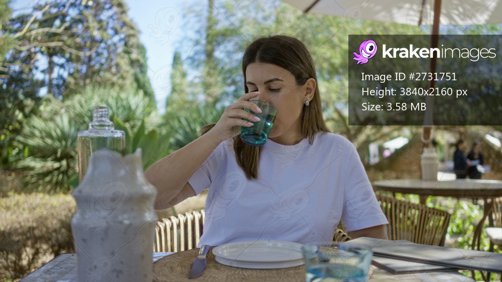 Woman enjoying an outdoor meal in a mediterranean restaurant while pouring water from a jug into a glass, surrounded by lush greenery and a serene atmosphere. - Kraken Images