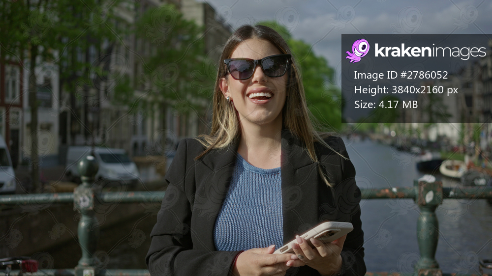 Woman enjoying canals with smartphone in sunny amsterdam, wearing sunglasses and capturing moments.