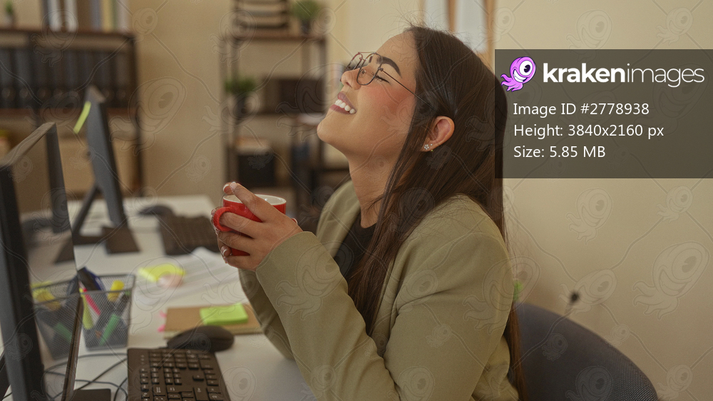 Woman enjoying coffee break in modern office workspace with computers scattered around and a sense of tranquility in her expression as she leans back in her chair. - Kraken Images